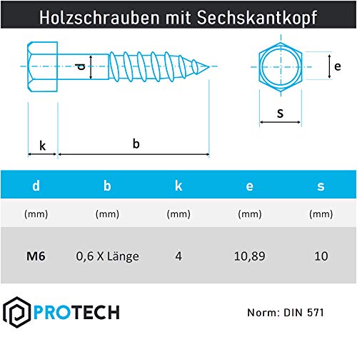 PROTECH 10 Stück Sechskant Holzschrauben M6 – DIN 571 – M6x25 Edelstahl A2 V2A Rostfrei Sechskantschrauben…