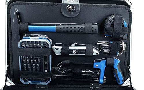 Enthält u.a. 1 Umschaltknarre mit Hilfe von diversen Aufsätzen, je 1 Wasserpumpenzange, Kombizange, Seitenschneider, Trapezmesser, Fäustel, Fuchsschwanz, Universalschere, Spannungsprüfer, Bandmaß wie auch verschiedenartige Gabelschlüssel, Schraubendreher, Innensechskantschlüssel des Weiteren Bits in unterschiedlichen Größen