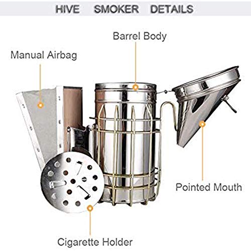 Bienenstockraucher: Der Bienenstockraucher besteht sämtliche Edelstahl, der sicheren, kühlen Rauch erzeugt, um die Bienen zu beruhigen und w?hrend der Bienenstockpflege vor Stichen zu schützen. Der Hitzeschutz, der den Raucher umgibt, verhindert Verbrennungen