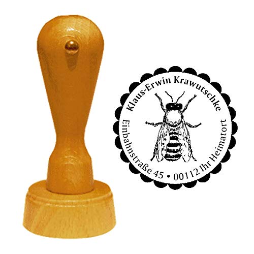 Der Adressstempel besteht jeglicher lackiertem Buchenholz und die Abdruckgröße des Stempels beträgt ca. Ø 40 mm.
