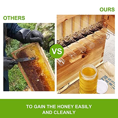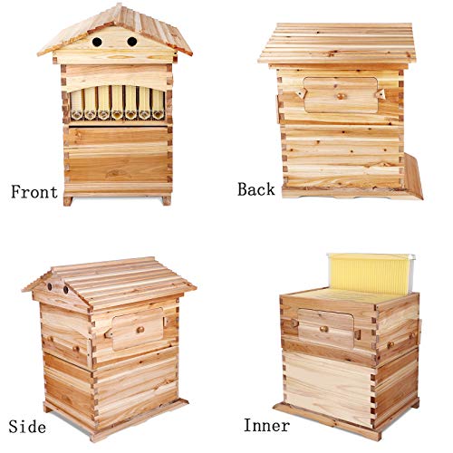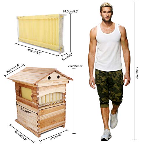 Hochwertige Konstruktion für Haltbarkeit: Die Rahmen der Bienenstöcke werden mit dem Regal aus weißem Kiefernholz geliefert, während der Bienenstock Super aus hochwertigem, natürlichem Tannenholz gefertigt ist, was sie ideal für den langfristigen Gebrauch macht. Noch wichtiger ist das Holzmaterial, das beim Bau des Bienenstocks verwendet wird, einer mechanischen Trocknungsbehandlung unterzogen, die dazu beiträgt, dass der Bienenstock nicht reißt. Die Außenwand des Honigstockhauses wurde ebenfalls poliert, um das Eindringen von Wasser zu verhindern.