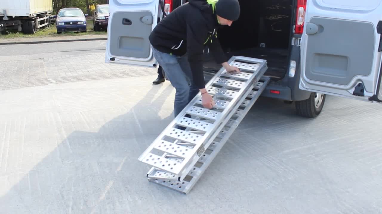 3 fach gefaltete Alu Rampe | die 3 Elemente sind mit Scharnieren zusammengenietet | sicher, bequem und allein das Motorrad verladen