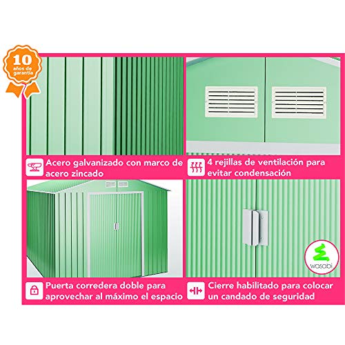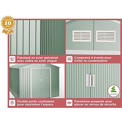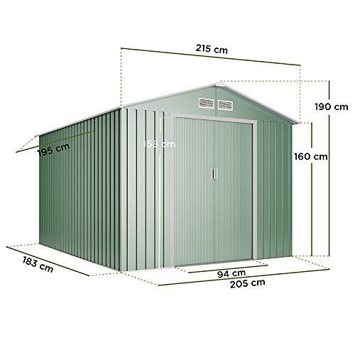 Das 4,19 m2 Gerätehäuschen hat ein modernes ansonsten exklusives Design. Das Satteldach unter Einsatz von 4 Lüftungsgitter welches 90Kg resistent ist ansonsten die doppelten Schiebetüren sind manche Ihrer Vorteile.