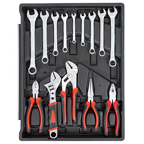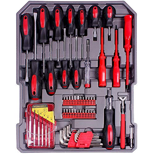 Technische Eigenschaften: 2 Klemmen 90 mm 60 Feststeller 1 Hammer, amerikanischer Typ, 1 selbstblockierende Kombizange 1 Zange für Kabel und Klemmen 200 mm 1 Flexometer 1 Klebepistole + Nachfüller 1 Schneider 1 magnetische Wasserwaage 6 Präzisionsschraubendreher 9 Sechskantschlüssel 24 Bits 1 Bit-Adapter 14 Schraubendreher 1 Ratschenkopf-Schraubendreher mit Umkehrfunktion 1 Tester 1 Adapter 12 Steckschlüssel 1/4 Steuer (0,64 cm) 17 Steckschlüssel 1/2 Steuer (1,27 cm) 2 Gelenke, 2 Verlängerungen auf 1/2 Steuer (1,27 cm) und 1/4 Steuer (0,64 cm) 1 flexible Verlängerung mit Gelenk 1/2 Steuer (1,27 cm) 2 Ratschenköpfe 1/2 Steuer (1,27 cm) und 1/4 Steuer (0,64 cm) 1 flexible Verlängerung 150 mm 1 Verlängerung 100 mm 1/4 Steuer (0,64 cm) 1 Zange 180 mm 1 Rollenschlüssel 200 mm 1 Greifzange 250 mm 1 Spitzzange 200 mm 1 Seitenschneider 10 Kombischlüssel 8-19 mm.
