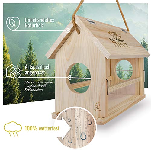 🥜 GANZJÄHRIGE FÜTTERUNG: Das Futterhaus für Vögel aus unbehandeltem Holz ermöglicht eine abwechslungsreiche und artgerechte Vogelfütterung mit Meisenknödel, Äpfeln, Samen, Kernen oder anderem Vogelfutter.