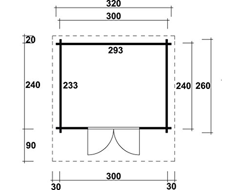 Außenmaß (B x T): 320 x 260 cm Dachstand (B x T): 360 x 350 cm Wandstärke: 34 mm Rauminhalt: 15,9
