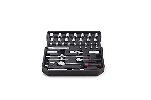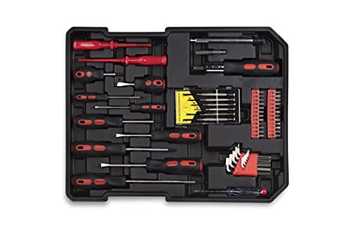 Toolbox mit Schubladen: In Schublade 1 finden Sie unterhalb anderem Steckdosen, Kupplungen, eine T-Bar, Verlängerungen und eine Ratsche. Schublade 2 enthält Schraubenschlüssel, Wasserpumpenzangen, Backenzangen und mehr. Schublade 3 enthält unterhalb anderem Isolierband, Crimp- und Greifzangen, Schrauben und Nägel. Schublade 4 enthält einen Satz Inbusschlüssel, Schraubendreher und einen Satz Bits.
