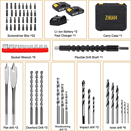 👌【Reichhaltiges Zubehör】 Sie erhalten 1×ZHJAN-Bohrmaschine, 2×1,5Ah-aufladbare Batterie, 1×Akkuladegerät, 17×Bohrer, 32×Schraubendreher-Bit, 1×Soft-Schaft, 9×Stecknuss-Bit, 1×Aufbewahrungsbox. Ein umfassendes Sortiment an Zubehör kann Ihre Arbeitsanforderungen fertig werden.